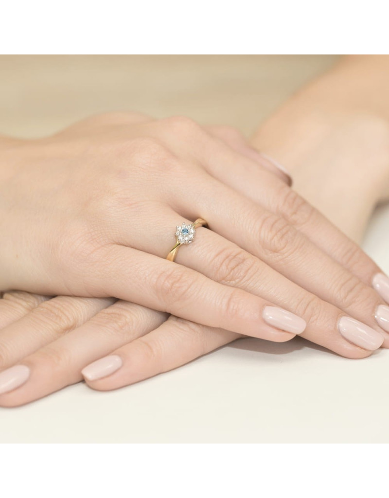 Pełen uroku pierścionek z żółtego złota ze szlachetnym topazem i lśniącymi brylantami w formie kwiatuszka.