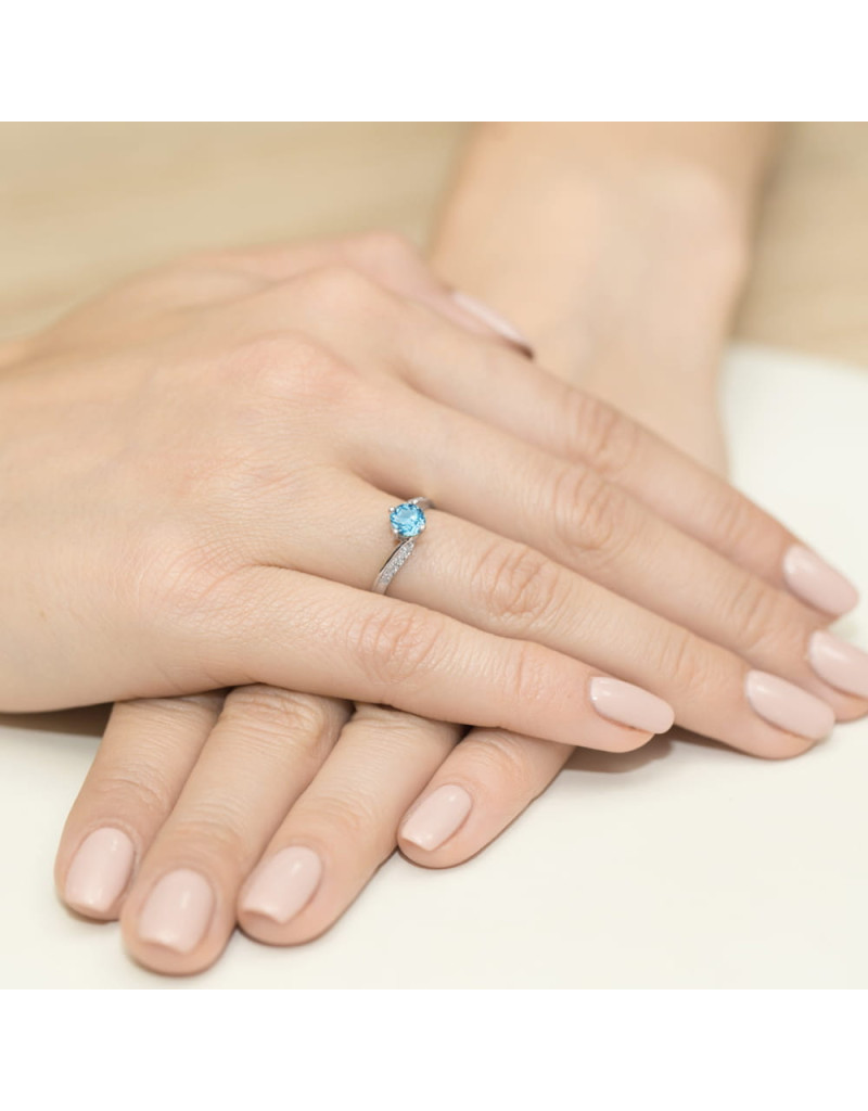 Pełen wdzięku pierścionek z białego złota z urokliwym topazem i brylantami w romantycznej oprawie.