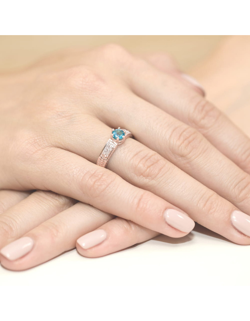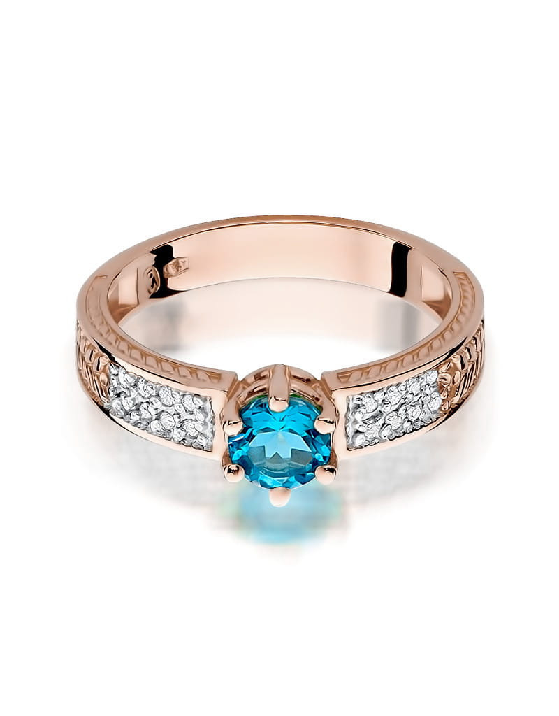 Ponadczasowy pierścionek z różowego złota z błękitnym topazem i lśniącymi brylantami na szynie, które dodają mu blasku.