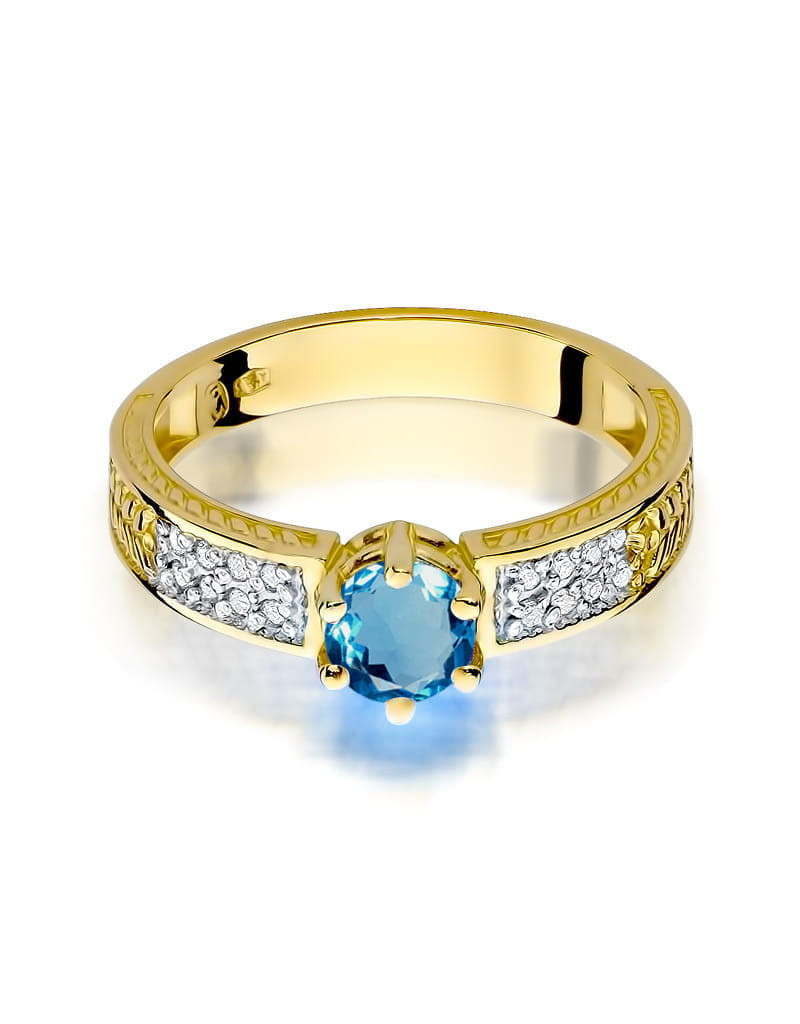 Ponadczasowy pierścionek z żółtego złota z ciemnobłękitnym topazem i lśniącymi brylantami na szynie, które dodają mu blasku.