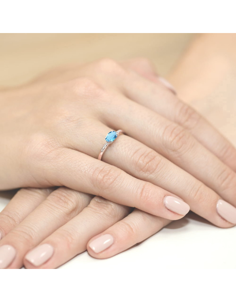 Wyjątkowy złoty pierścionek z błękitnym topazem oraz lśniącymi brylantami w eleganckiej oprawie.