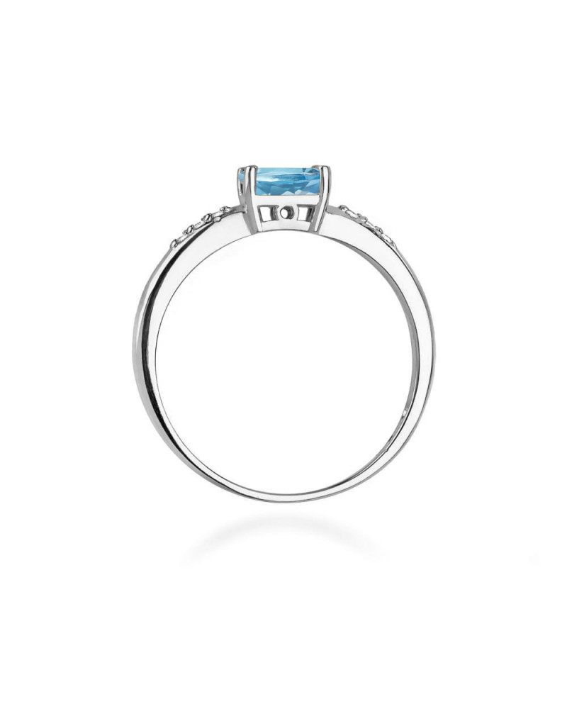 Wyjątkowy złoty pierścionek z błękitnym topazem oraz lśniącymi brylantami w eleganckiej oprawie.