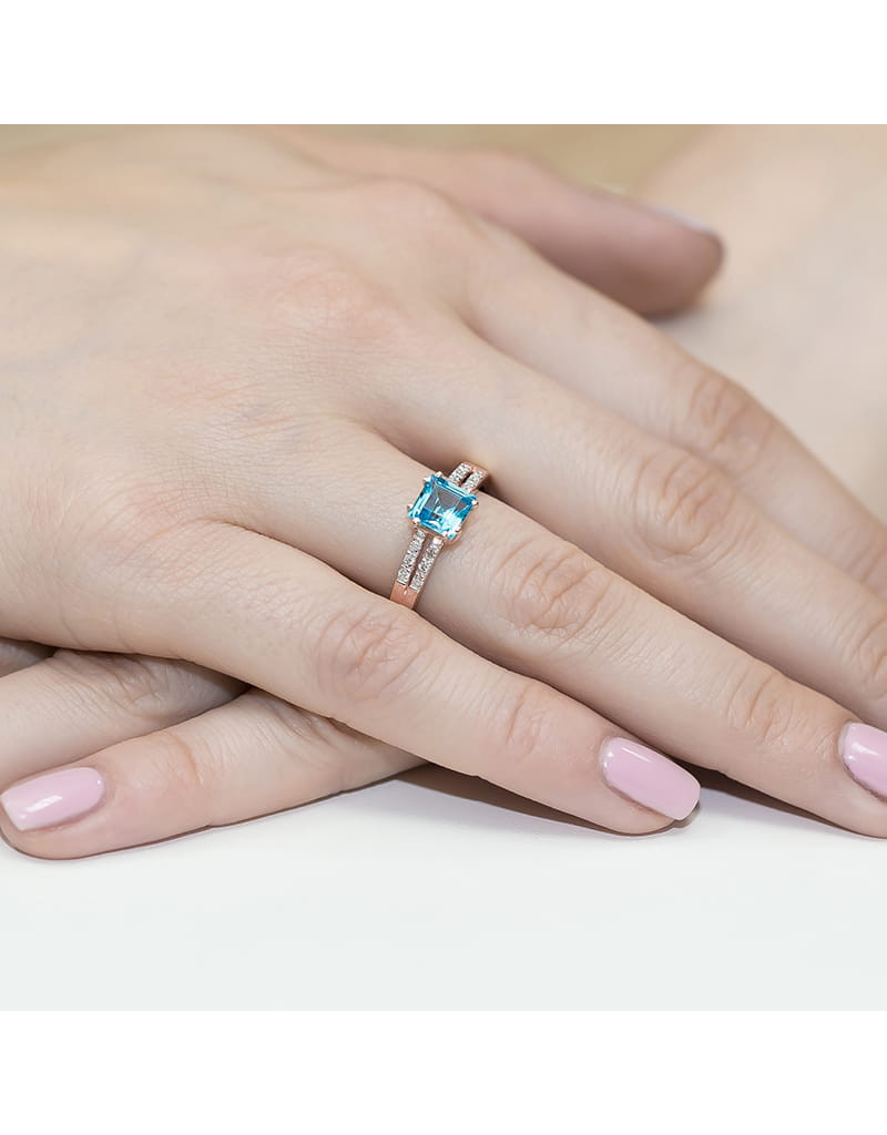 Stylowy pierścionek z różowego złota z kwadratowym topazem i 12 brylantami które dodają mu blasku.