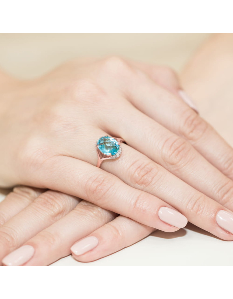 Zachwycający złoty pierścionek z owalnym topazem w subtelnej oprawie z 8 brylantami.