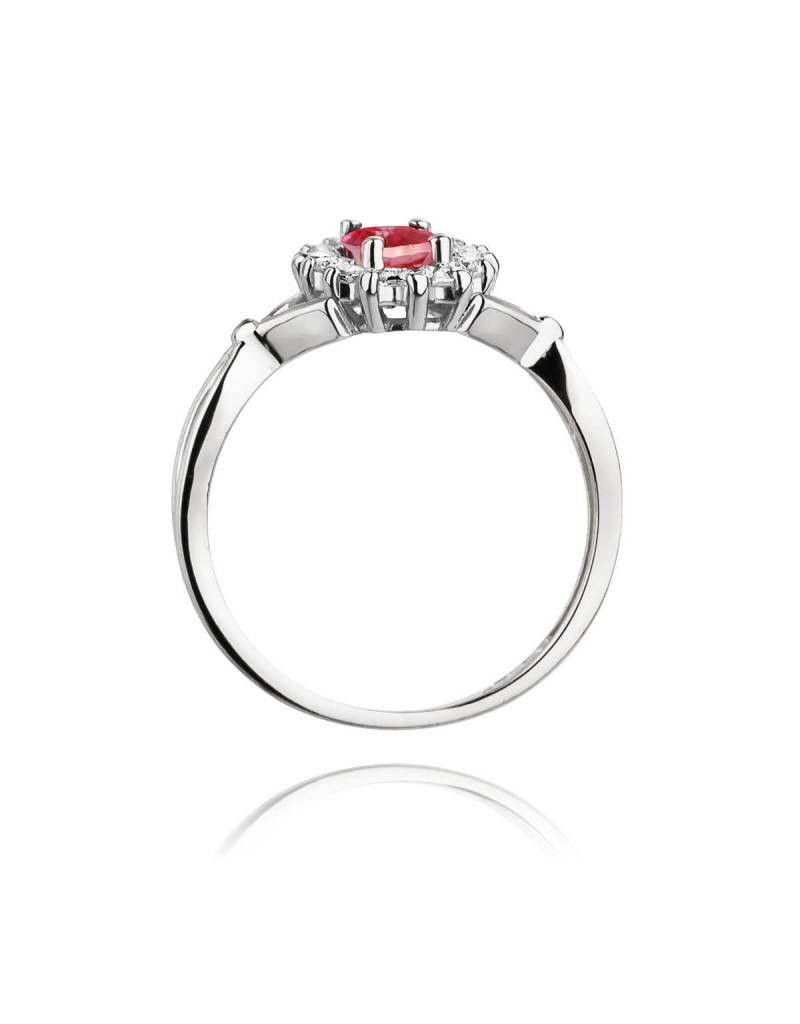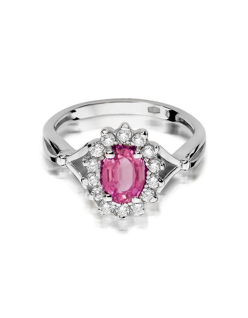Godny podziwu pierścionek z białego złota z 14 brylantami dookoła zachwycającego różowego topazu.