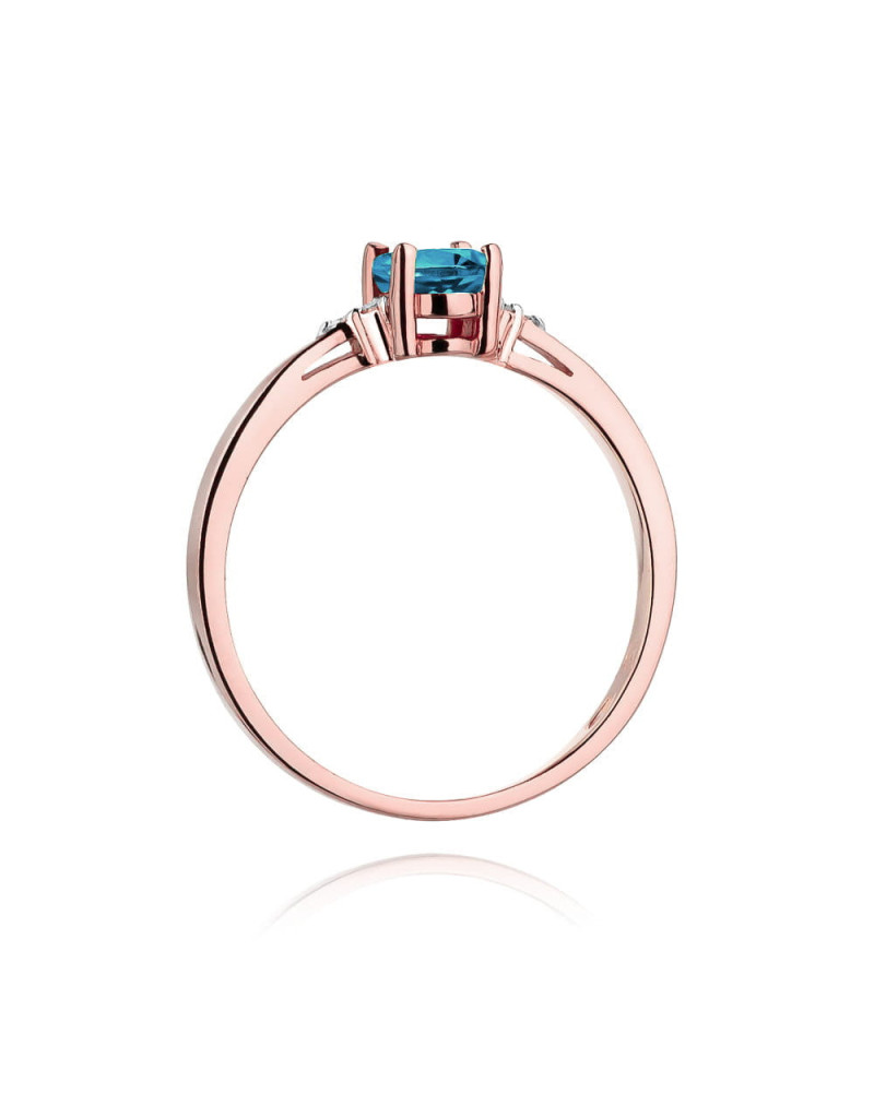 Urzekający pierścionek wykonany z różowego złota z przepięknym błękitnym topazem oraz brylantami, które dodają mu blasku.