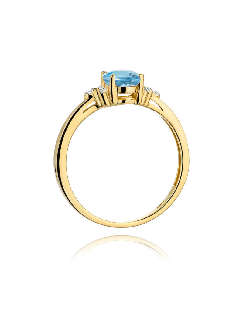 Elegancki, klasyczny pierścionek z przepięknym błękitnym topazem i rozświetlającymi go 6 brylantami.