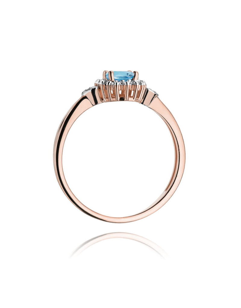 Ponadczasowy wzór złotego pierścionka z błękitnym topazem w krystalicznej oprawie z 20 brylantami, oraz 2 subtelnymi serduszkami.