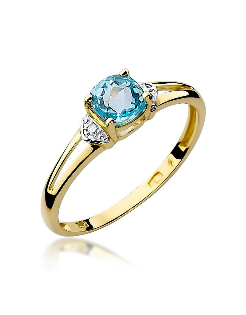 Urokliwy złoty pierścionek z błękitnym topazem i lśniącymi brylantami.
