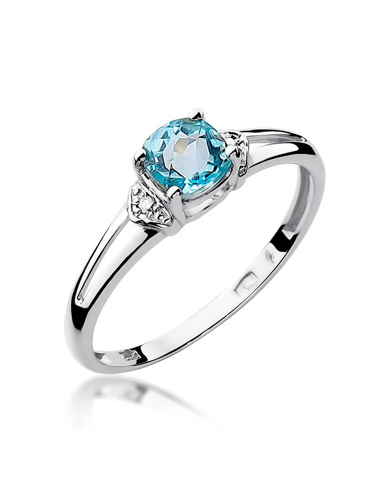 Urokliwy pierścionek z białego złota z błękitnym topazem i lśniącymi brylantami.