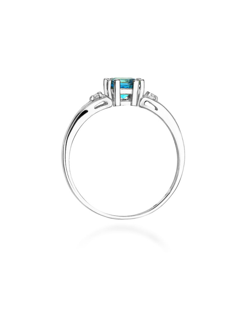 Niebanalny pierścionek wykonany z białego złota z kwadratowym topazem i 2 brylantami.