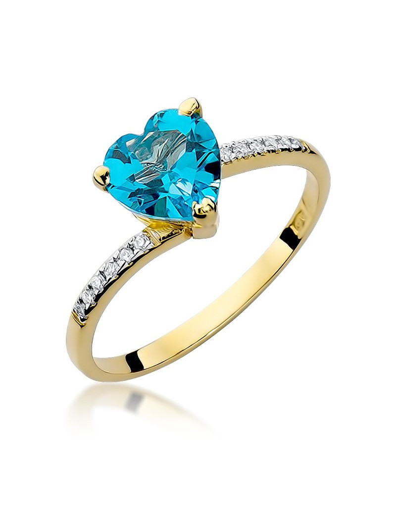 Pełen uroku pierścionek wykonany z żółtego złota ze zjawiskowym topazem w kształcie serca z 12 brylantami które dodają mu blasku.