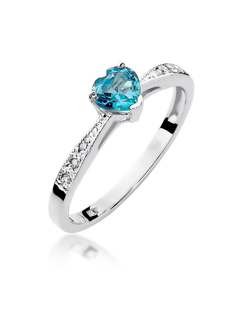 Romantyczny pierścionek z białego złota z błękitnym topazem w kształcie serca, oraz brylantami które podkreślają jego blask.