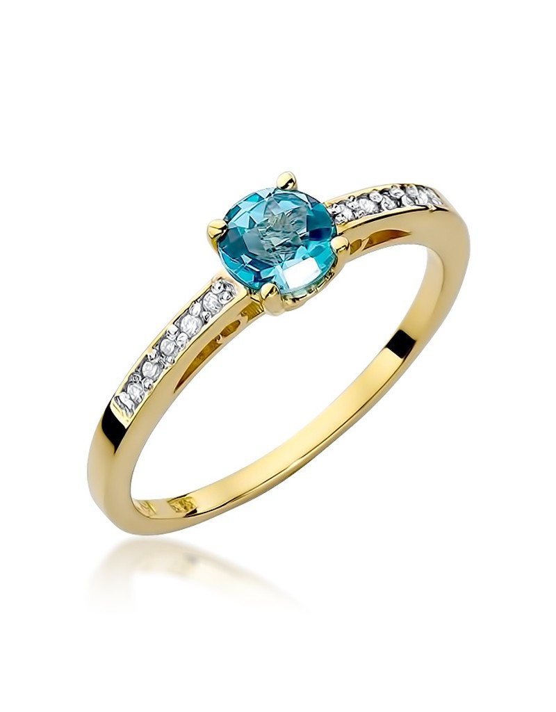 Uroczy pierścionek z żółtego złota z okrągłym topazem w czteroramiennej koronie oraz lśniącymi brylantami.