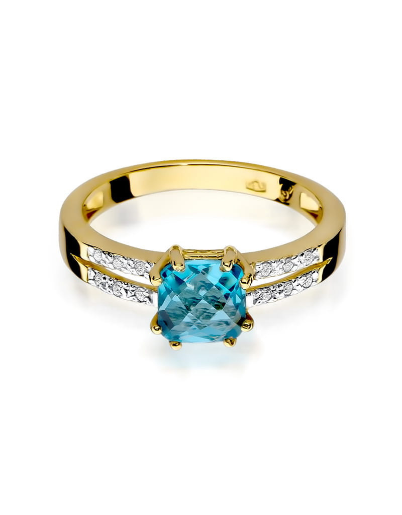 Stylowy pierścionek z żółtego złota z kwadratowym topazem i 12 brylantami które dodają mu blasku.