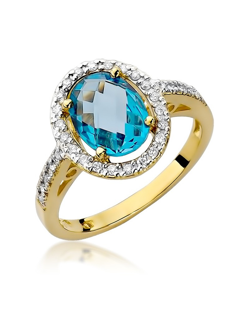 Oryginalny wzór złotego pierścionka z wysoko cenionym topazem i brylantami które go otaczają dodając mu lśnienia.