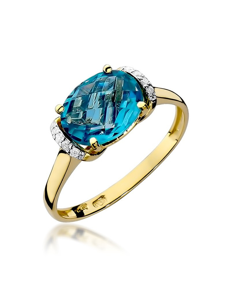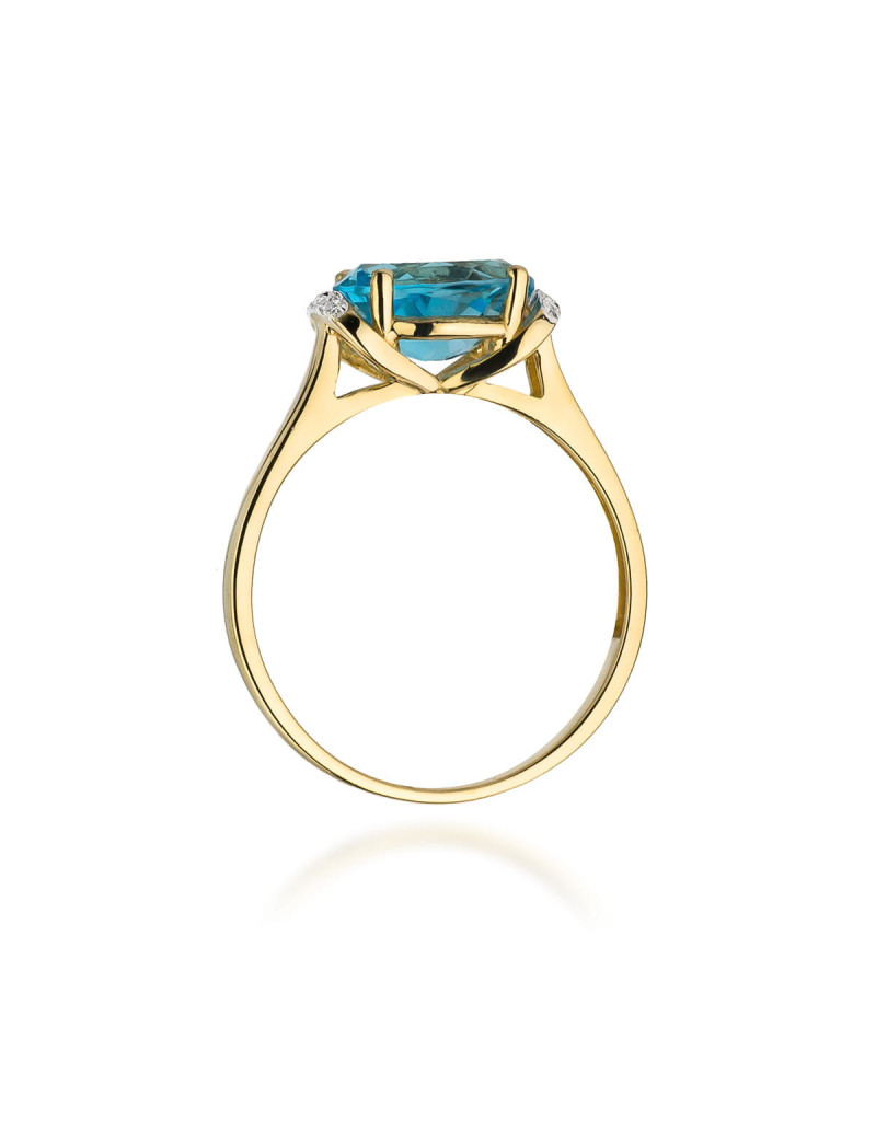 Pełen uroku pierścionek z żółtego złota z niebiańskim topazem, oraz brylantami dodającymi blasku.