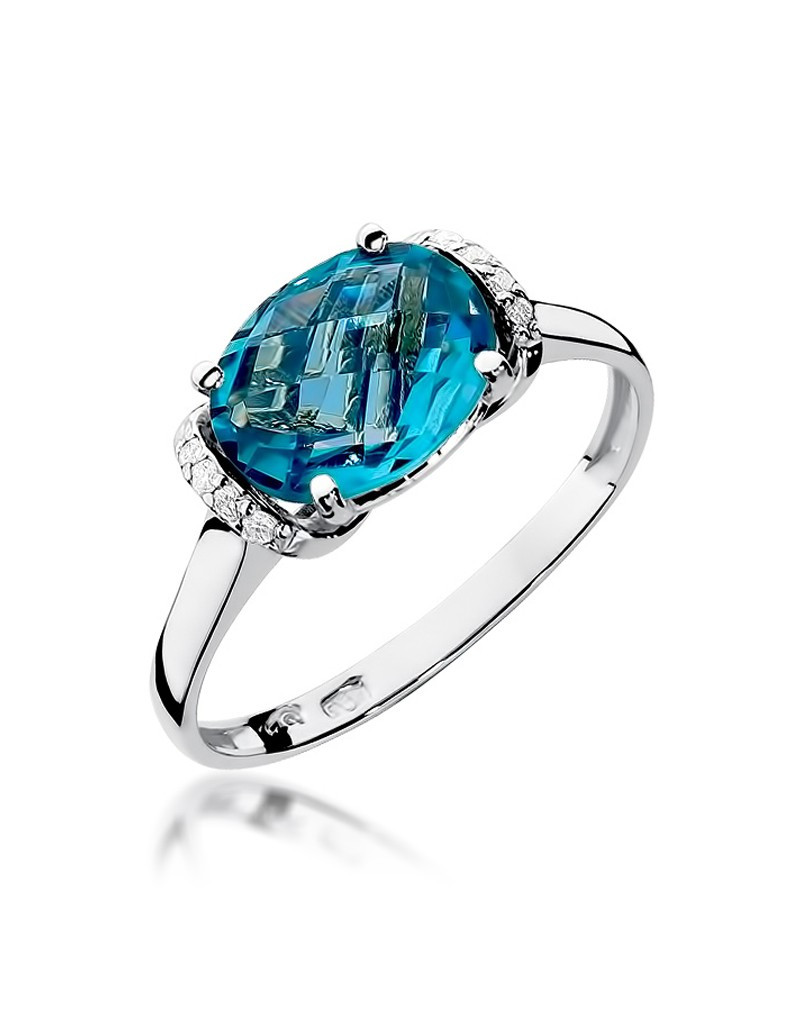 Pełen uroku pierścionek z białego złota z niebiańskim topazem oraz brylantami dodającymi blasku.